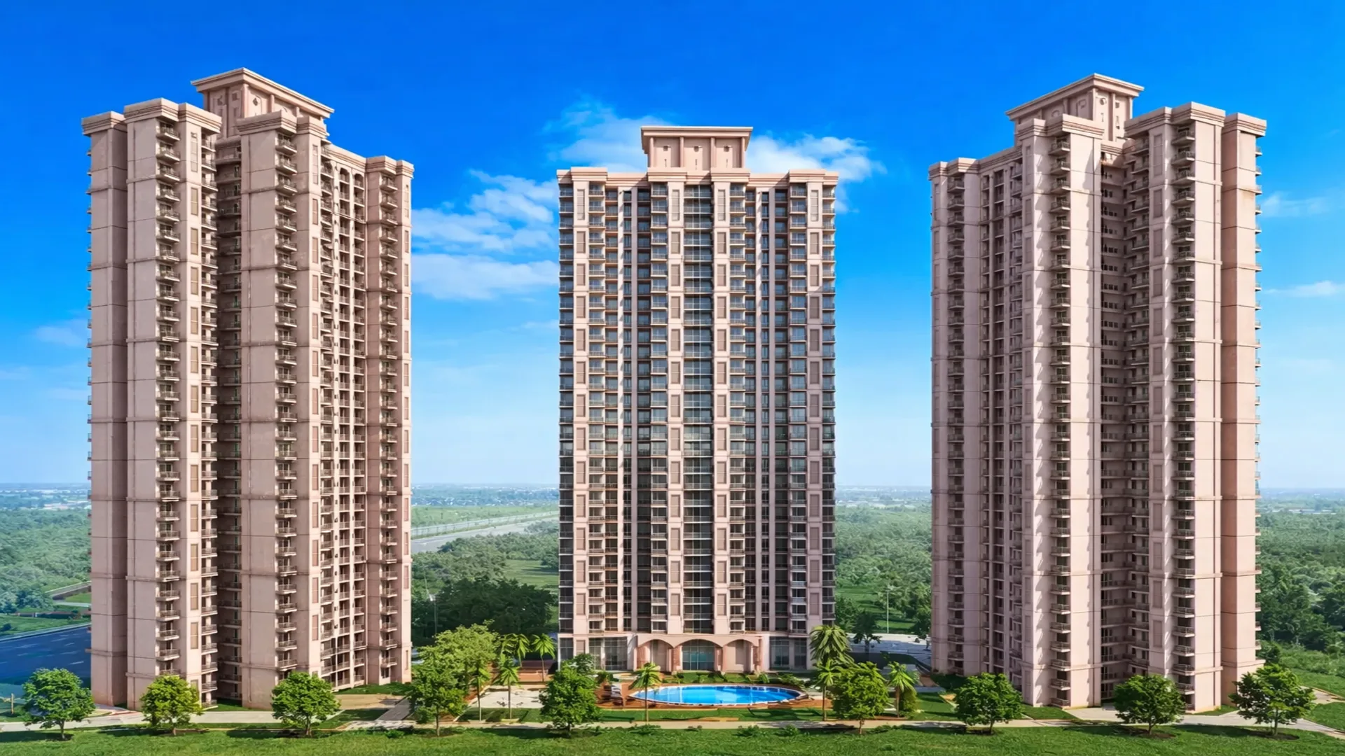 Residents have access to a 9,500 sq. ft. clubhouse, a swimming pool, a fully equipped gymnasium, a multipurpose hall, a business center, and 80% dedicated open green space with landscaped gardens.